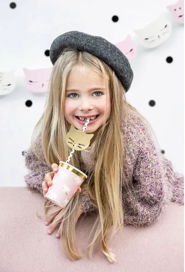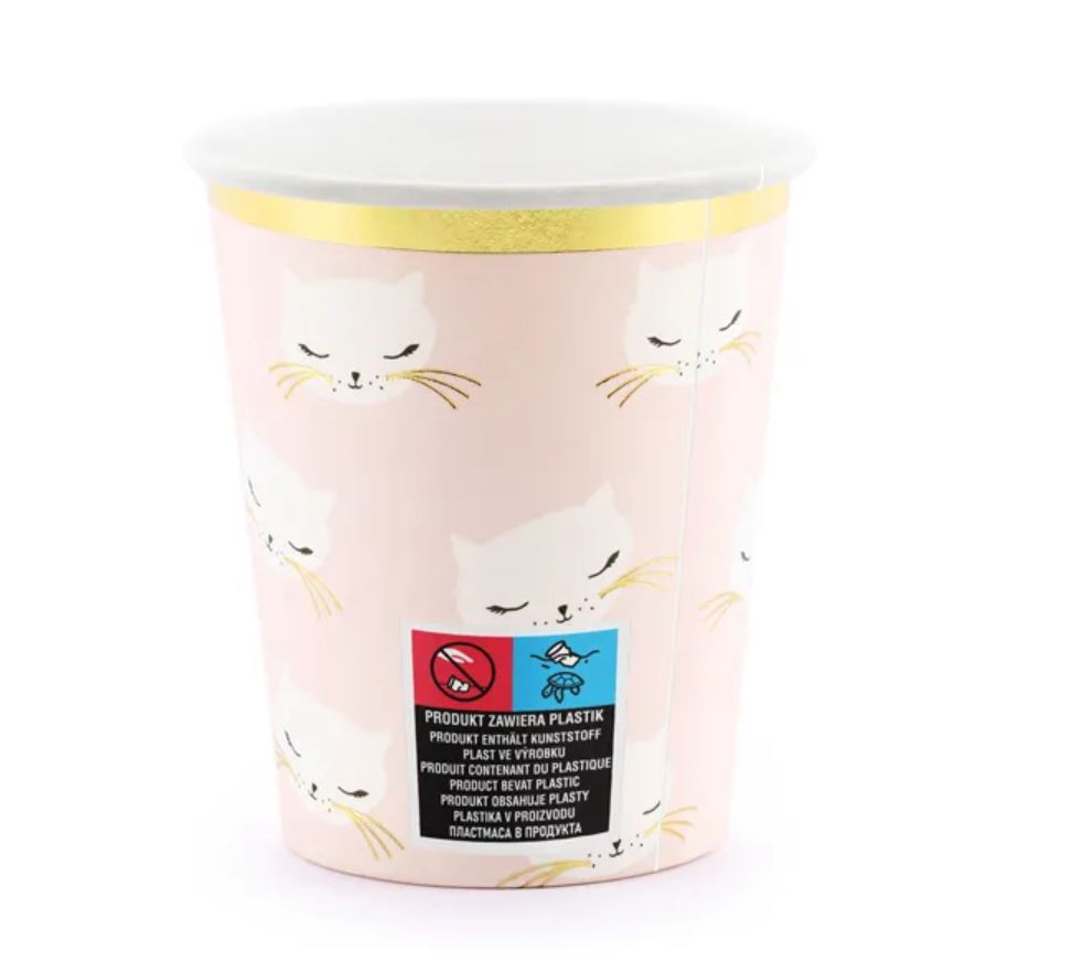 6 zuckersüße Pappbecher mit Katzengesichtern. Das rosa und goldene Design lässt besonders Kinderherzen höher schlagen. Aber auch für einen lustigen Mädelsabend sind diese Becher ein witziger Blickfang.