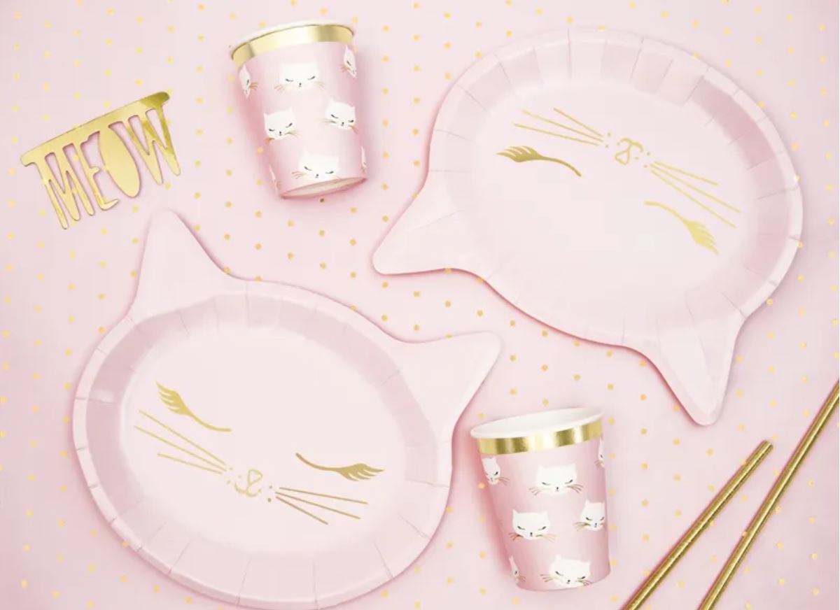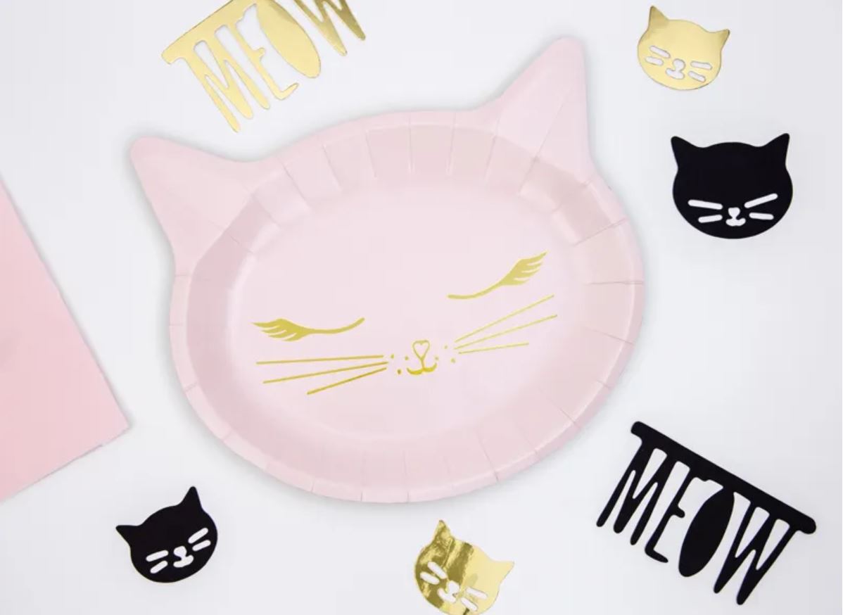 6 zuckersüße Pappteller in Form eine Katzengesichts. Das rosa und goldene Design lässt besonders Kinderherzen höher schlagen. Aber auch für einen lustigen Mädelsabend oder Junggesellinnenabschied sind diese Teller ein witziger Blickfang.