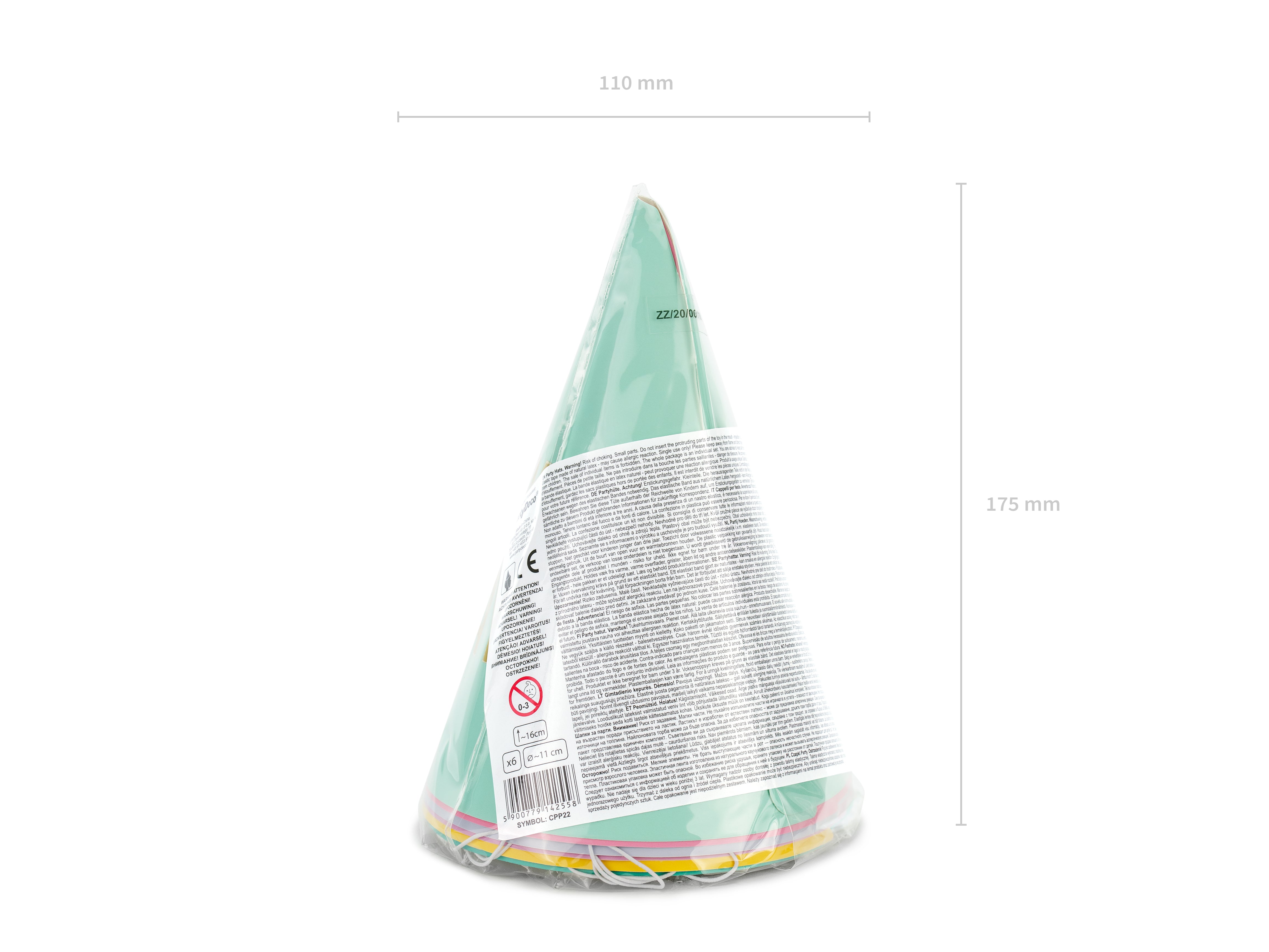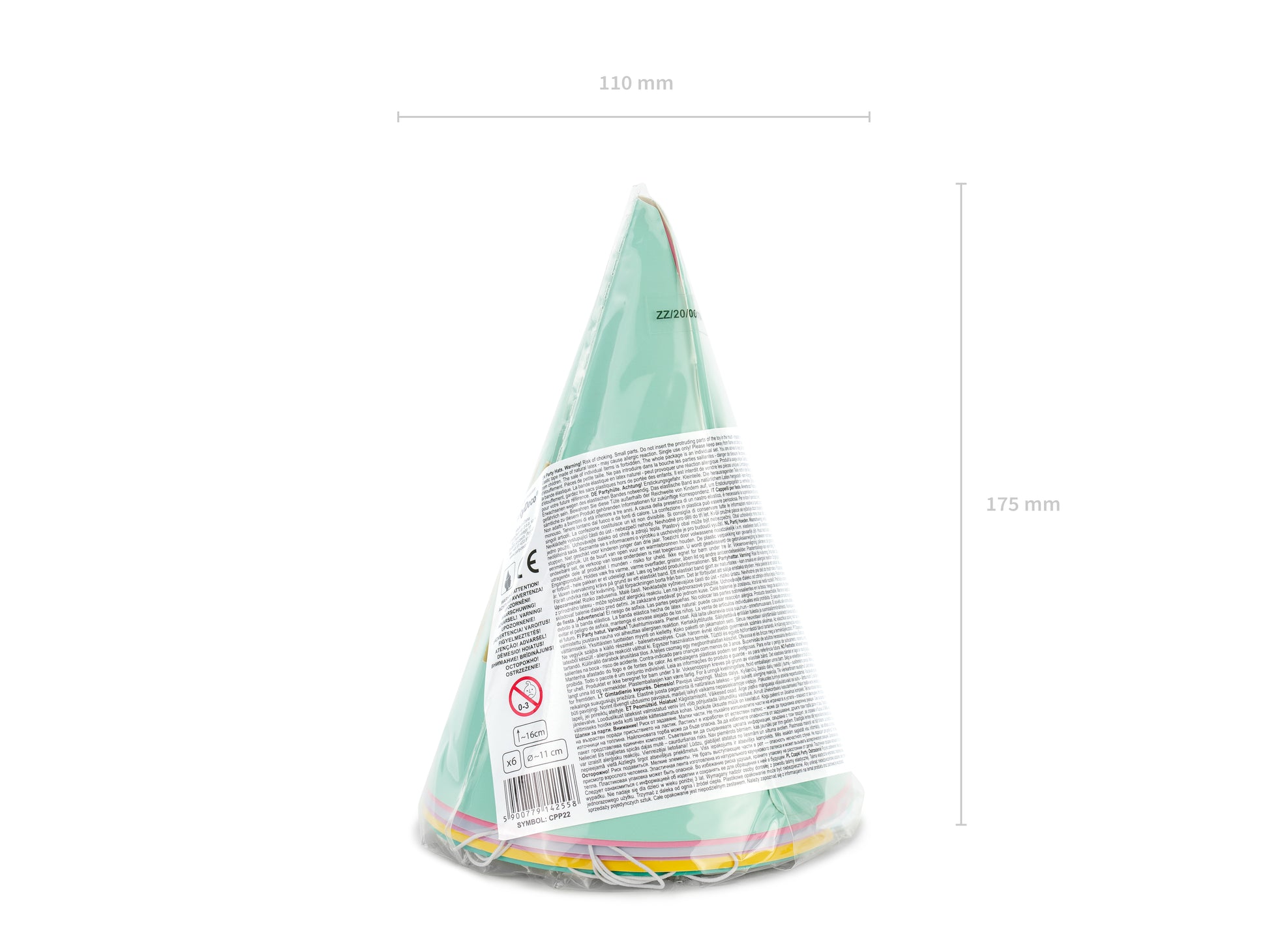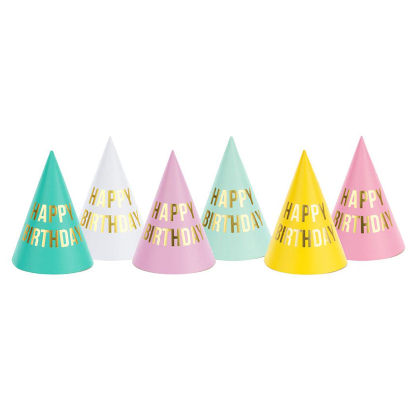 Partyhütchen Happy Birthday pastell 6er, 16cm | Geburtstagshütchen