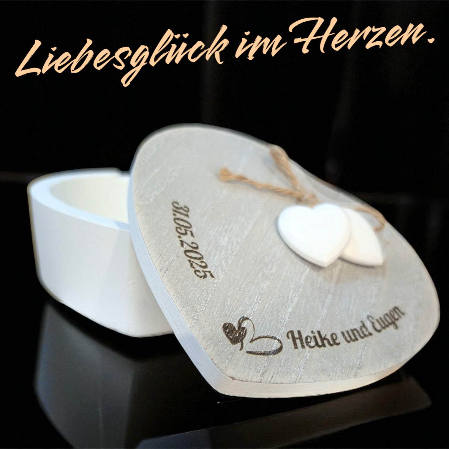 Gestalten Sie Ihre ganz persönliche Holzherzdose. Ob Namen, Daten oder ein besonderer Spruch – wir gravieren Ihre Wünsche auf den Deckel. Ein liebevolles Geschenk, das von Herzen kommt.