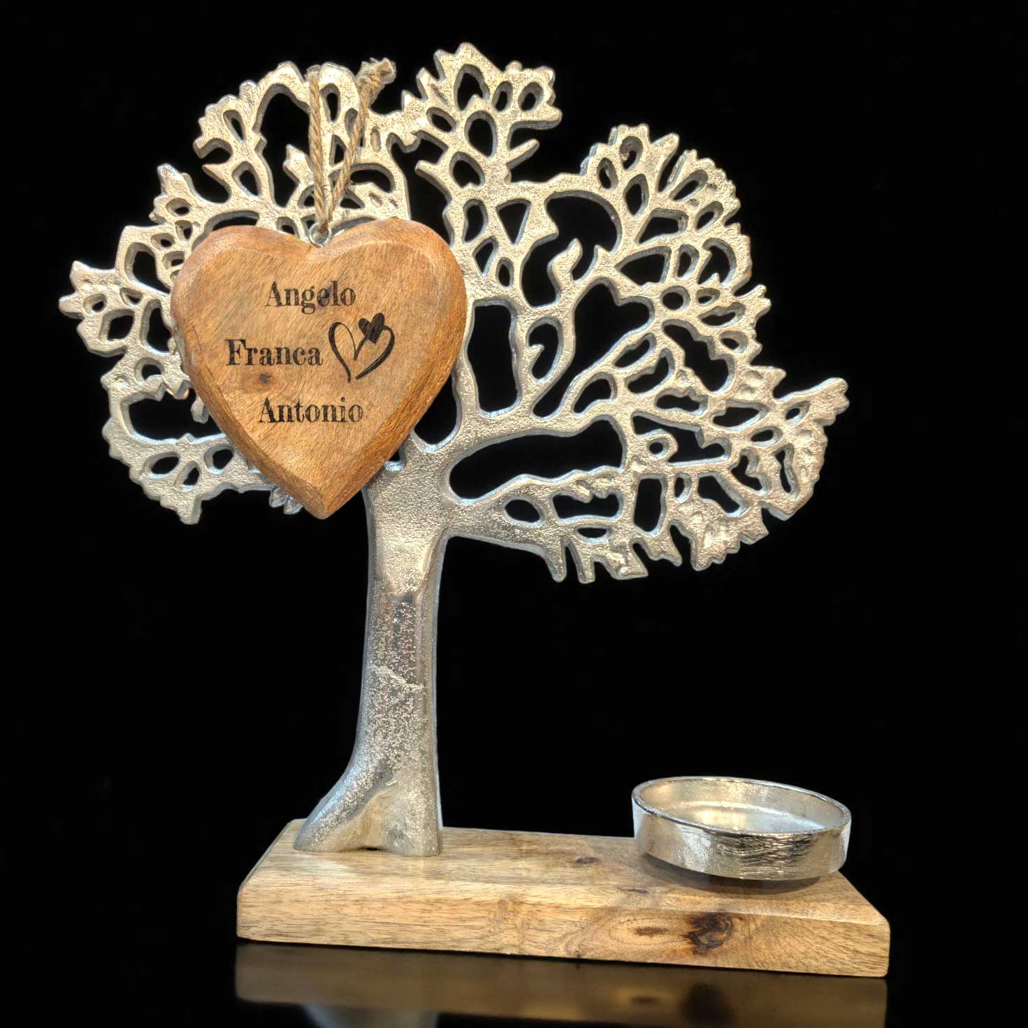 Auf einem recheckigen Holzfuß steht stolz ein silberner Baum des Lebens, neben ihm eine kleine Schale passend für ein Teelicht.