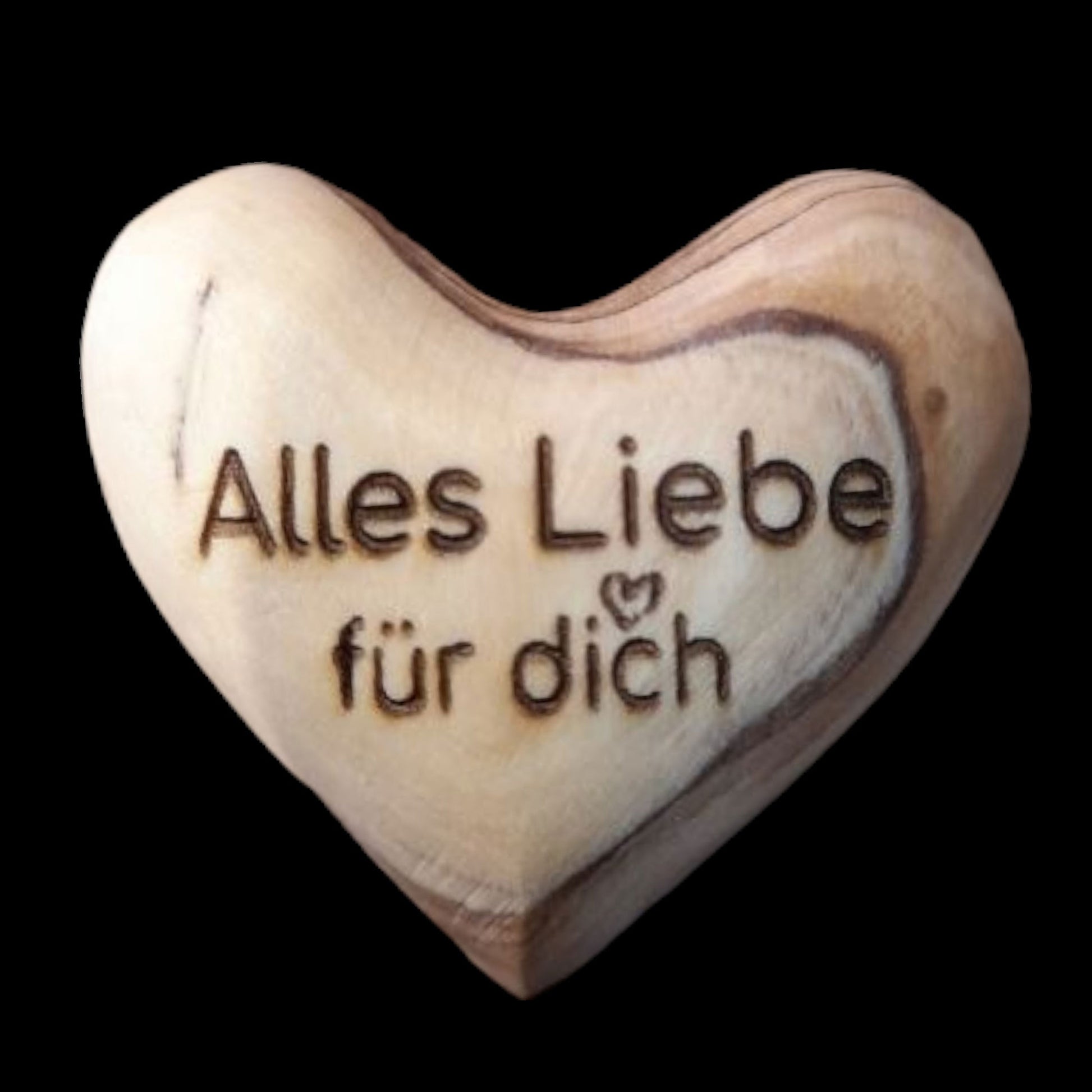 Aus feinstem Olivenholz gefertigt zeigt sich dieses Herz mit einer auffälligen Maserung. Jedes für sich ist schon ein kleines Unikat – und dank der Gravur deines Wunschtextes lässt sich dieses kleine Geschenk perfekt weiter individualisieren.
