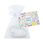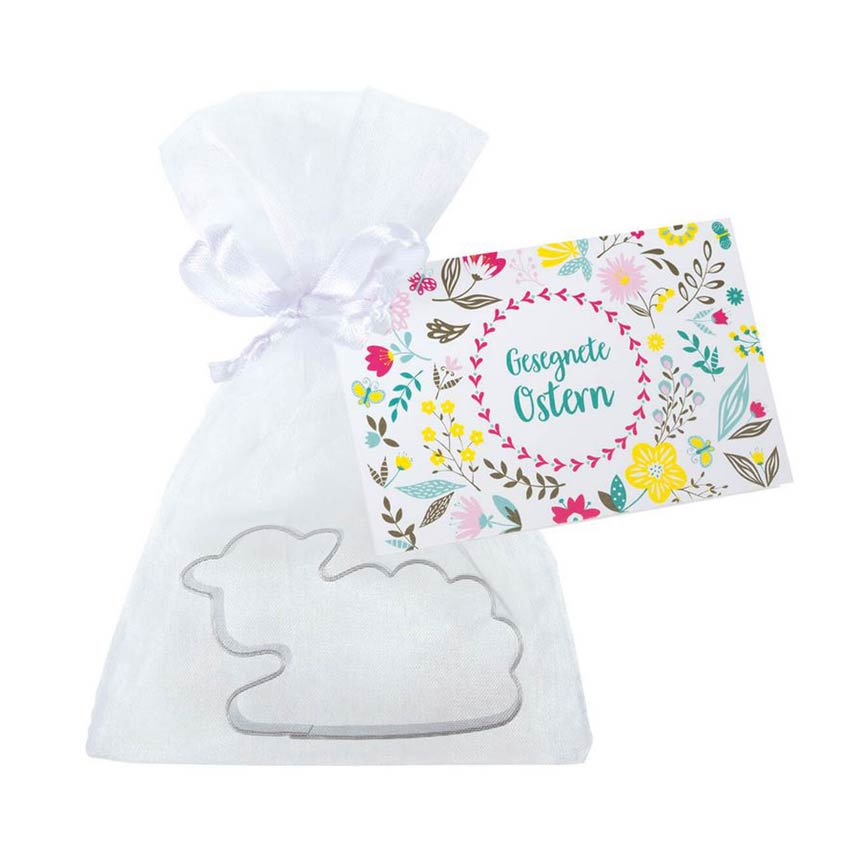Ein fertiges, kleines Geschenkset zu Ostern bestehend aus einem Keksausstecher in Form eines Schafs, verpackt in einem Organzabeutel und mit einer fröhlich-bunten Karte mit dem Aufdruck "Gesegnete Ostern". Im Inneren der Karte ist ein Rezept für leckere Schäfchenkekse abgedruckt, sodass sofort in der Osterbäckerei gestartet werden kann.