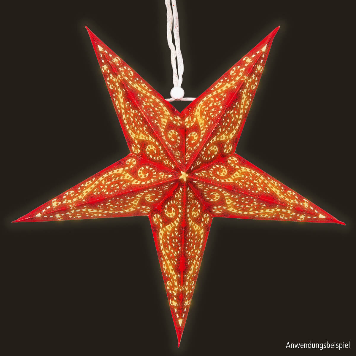 Der Stern wird aus stabilem Papier aufgefaltet und mit einem verstellbaren Stopper an der Zugkordel sicher zusammengehalten. Die Kordel kann zudem zum Aufhängen genutzt werden.