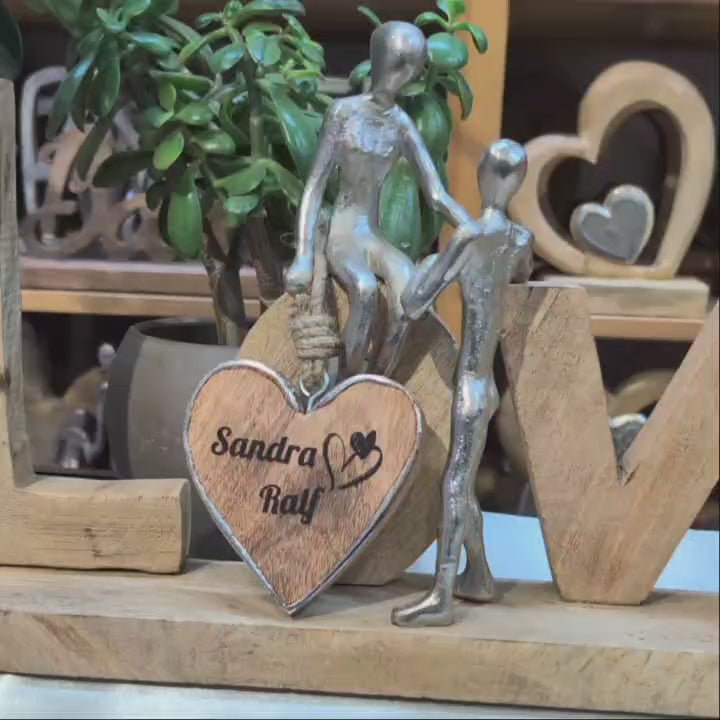 Der Aufsteller zeigt in großen Holzbuchstaben das Wort Love. Auf den Buchstaben himmelt sich ein silbernes Pärchen aus Metall an.
