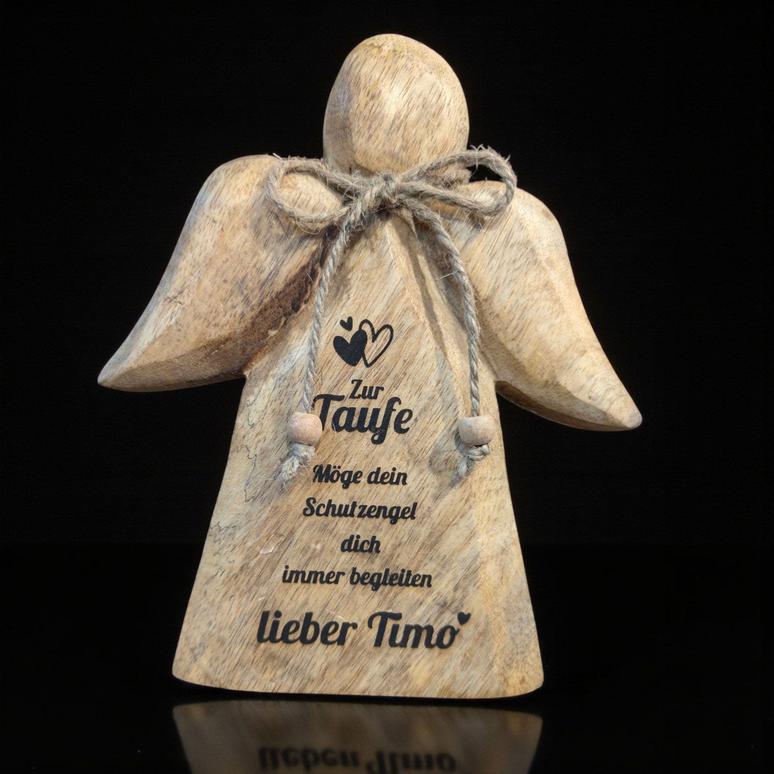 Der schlicht gestaltete Engel aus gemasertem Mangoholz lässt sich mit jedem beliebigen Wunschtext gravieren und eignet sich so als Geschenk für die verschiedensten Anlässe.