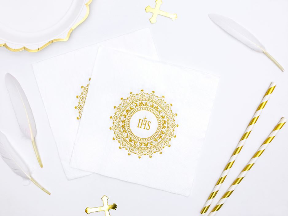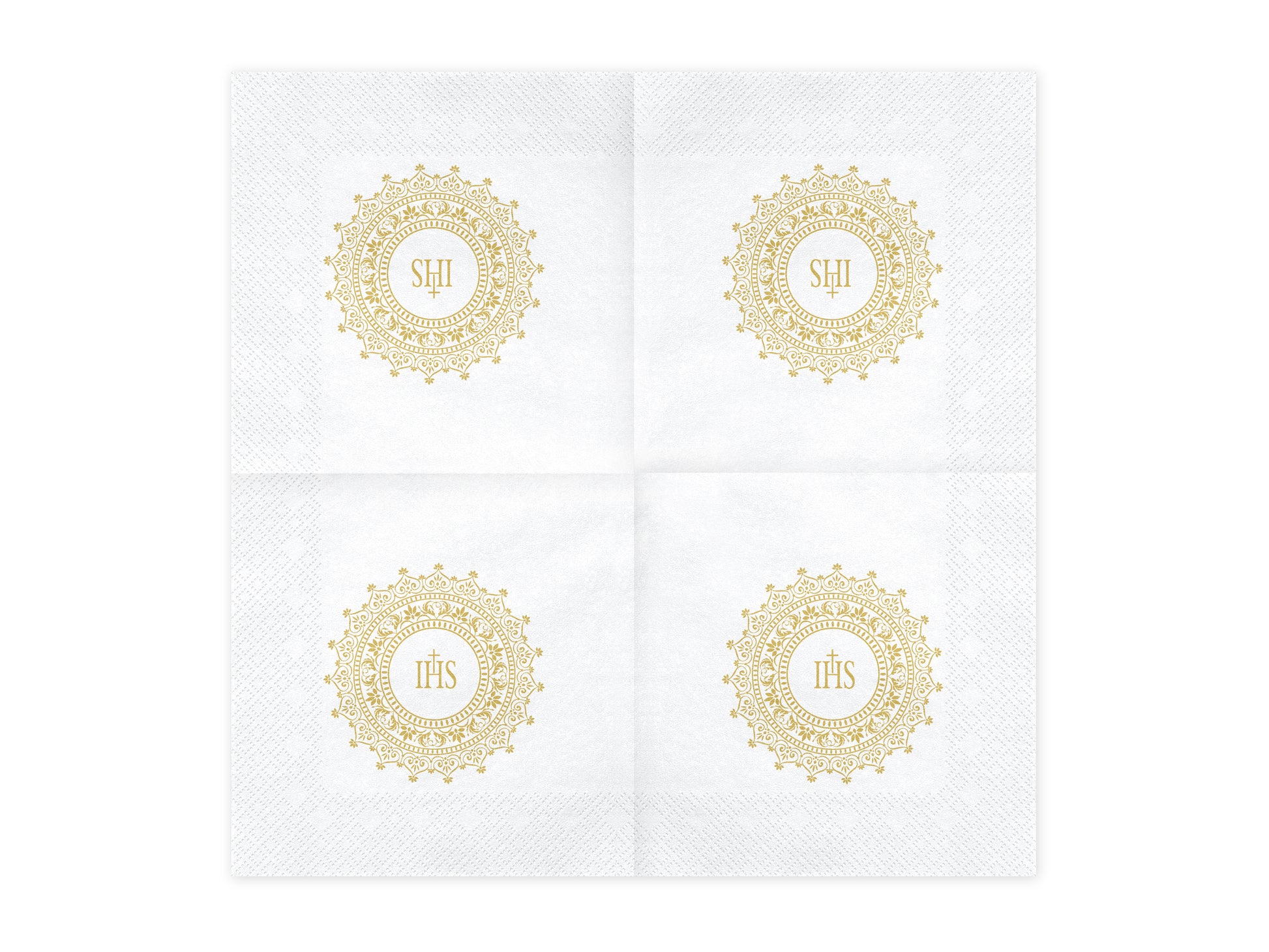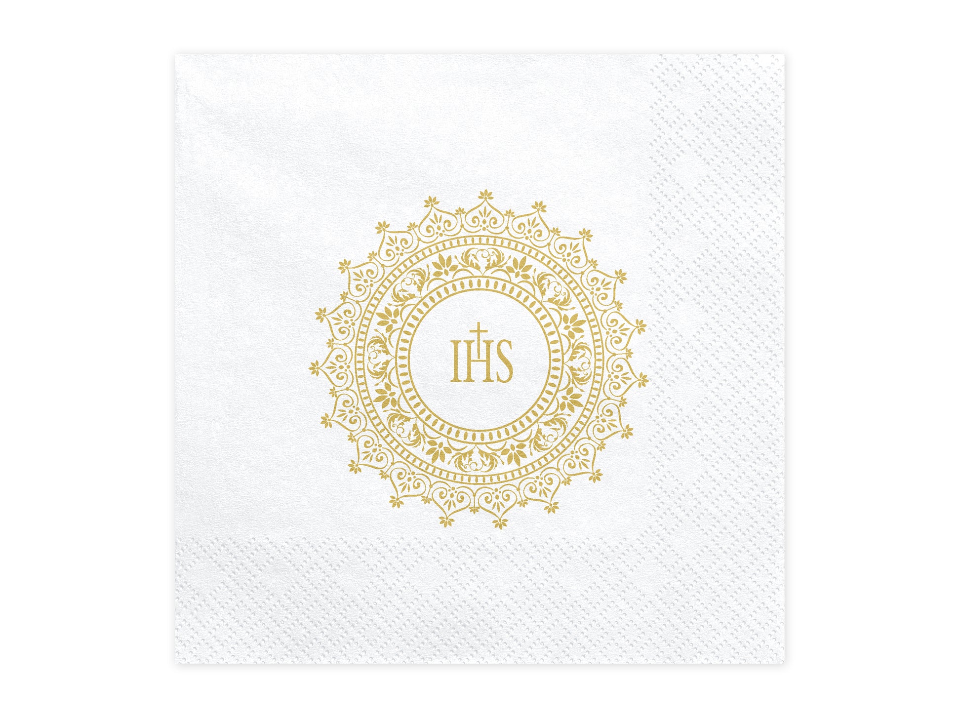 Kommunion Servietten | Wunderschöne Servietten mit einem kreisförmig angeordneten Muster aus detailreichen Ornamenten. In der Mitte ist das Christusmonogramm IHS mit einem Kreuz zu sehen.