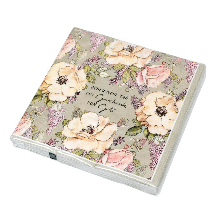 Servietten im Blumen Design mit Spruch "Jeder neue Tag ein Geschenk von Gott" 20Stk.