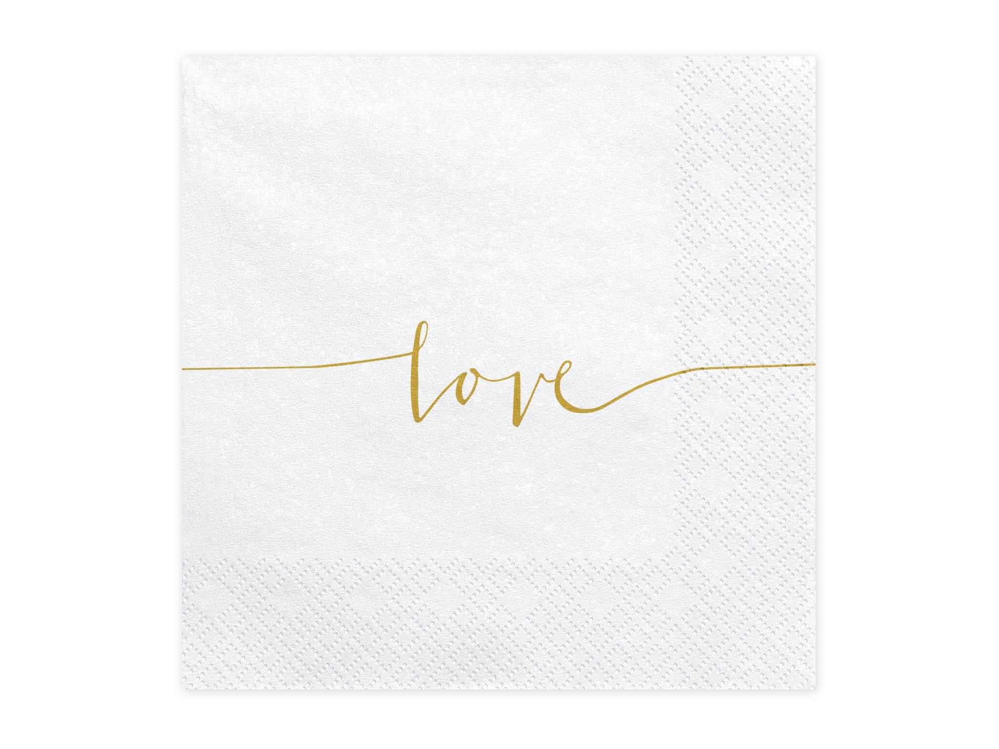 Servietten Hochzeit | die Farbe weiß steht für Reinheit und wirkt feierlich, die goldene Love-Schrift setzt passende Akzente und bewirkt durch die goldfarbene Schrift eine edle Note. Servietten zur Hochzeit sind ein wichtiger Bestandteil der Tischdekoration und sollten mit Liebe gewählt werden. Mit diesem Artikel liegen Sie goldrichtig!