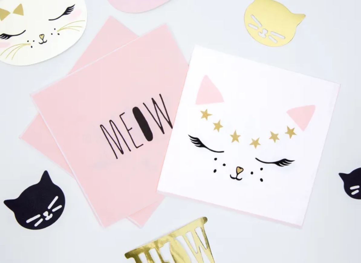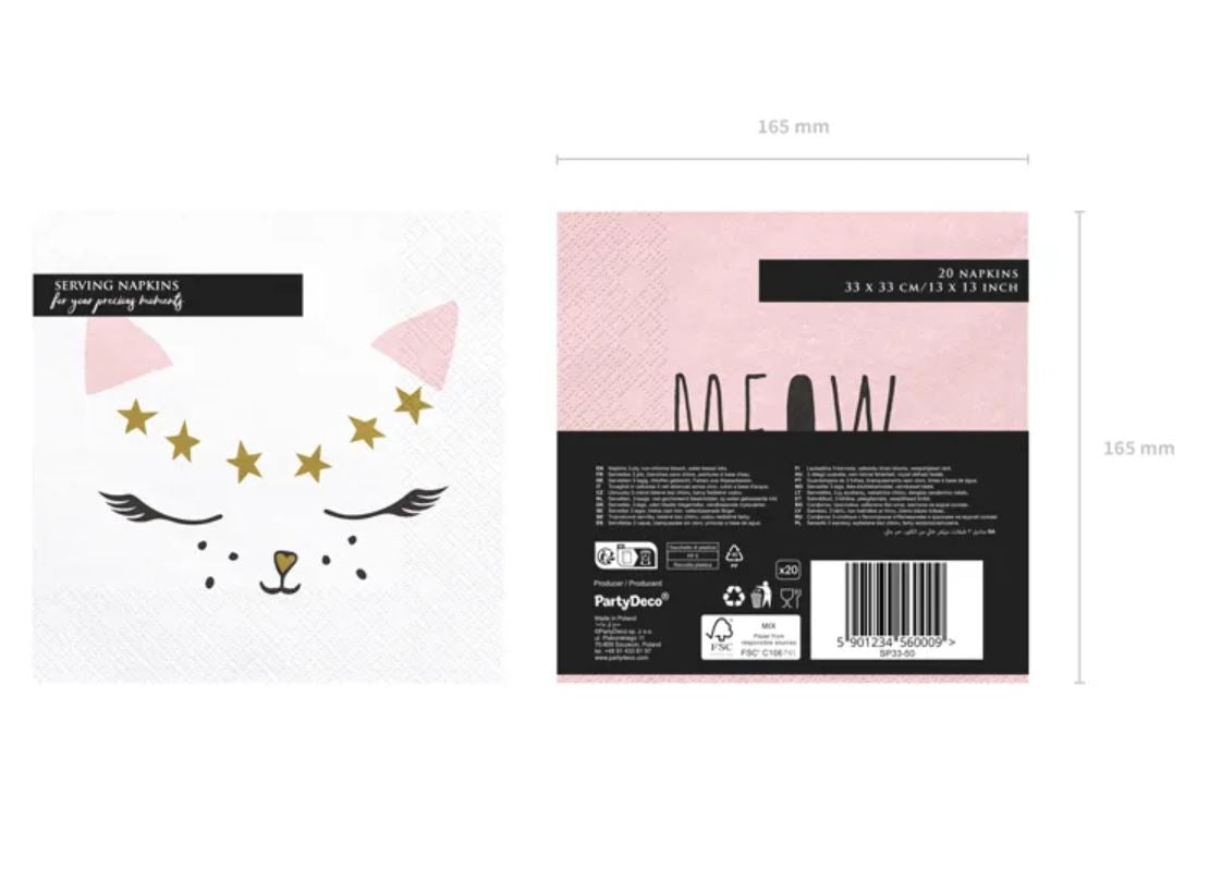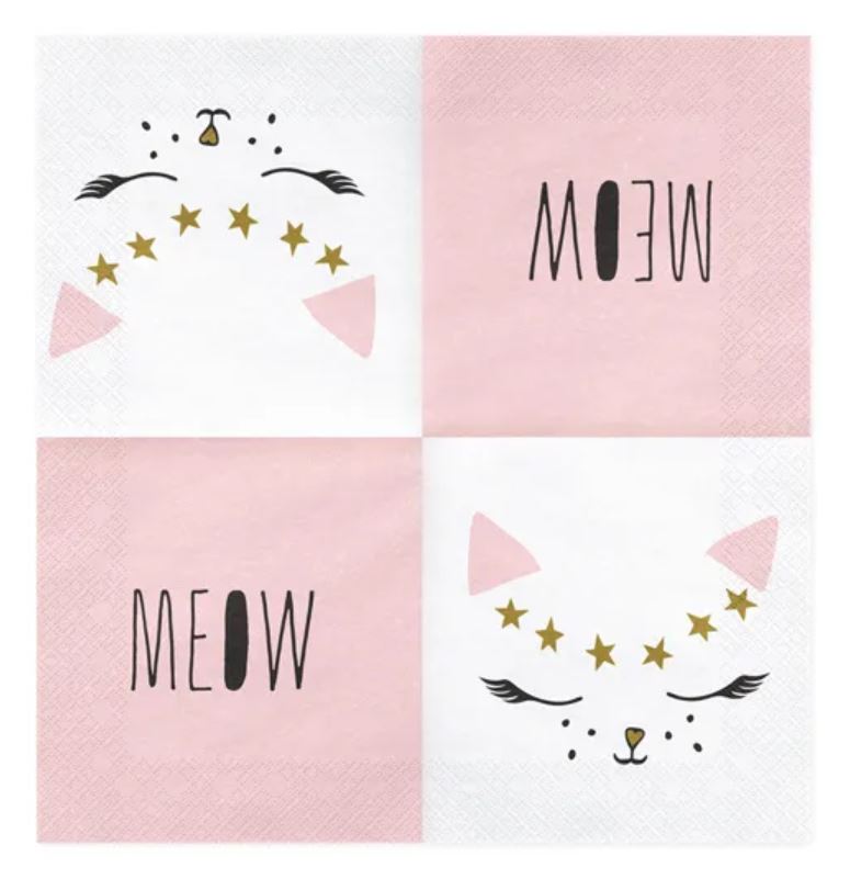 Zuckersüße Servietten mit Katzengesicht und und dem Wort "MEOW". Das rosa und weiße Design lässt besonders Kinderherzen höher schlagen. Aber auch für einen lustigen Mädelsabend oder Junggesellinnenabschied sind diese Partyservietten ein witziger Blickfang.
