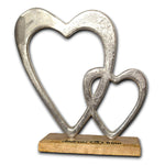 Ein großes Herz und ein kleines Herz zusammen auf einem Holzsockel.