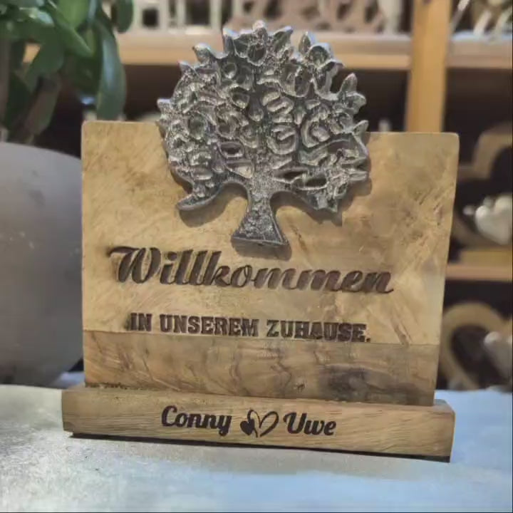 Eine handliche Standbotschaft aus Holz, welche eure Gäste willkommen heißt. Das Holz zeigt sich mit seiner natürlichen Maserung. Veredelt wird diese Flurdekoration durch einen silbernen Lebensbaum in einer strukturierten Antikoptik. Der matte Glanz stellt einen eleganten Kontrast zu dem bodenständigen Holz dar und sorgt dafür, dass der Holzaufsteller "Willkommen" sowohl gemütlich als auch modern wirkt.