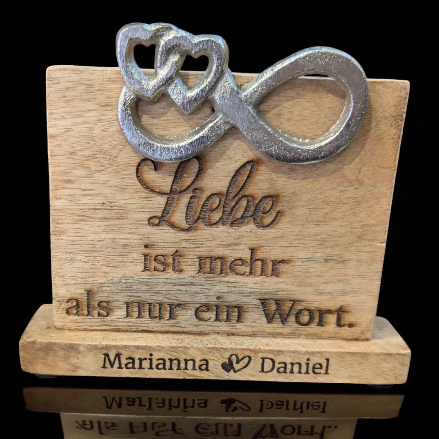Der hochwertige Holzaufsteller „Liebe ist mehr als nur ein Wort“ trägt zusätzlich ein glänzendes silbernes Unendlichkeitszeichen, welches die zeitlose Kraft der Liebe symbolisiert.