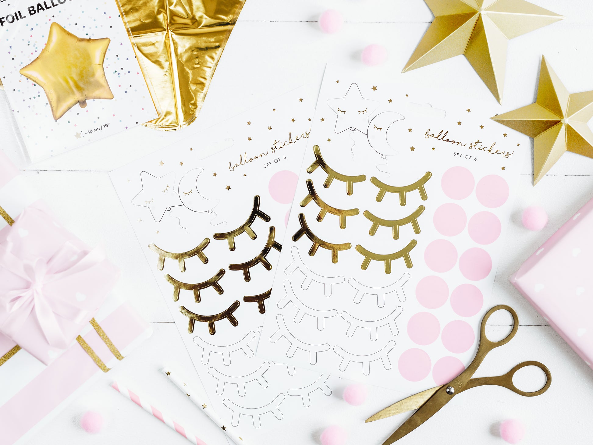 Zuckersüße Sticker in Form von geschlossenen Augen und kleinen rosa Kreisen, die wie errötete Wangen wirken. Die Sticker Wimpern sind ideal zum Basteln oder als Verzierung geeignet. Verleihen Sie Luftballons, Einladungskarten, Deko-Fächern oder Geschenken einen ganz neuen und lieblichen Look.