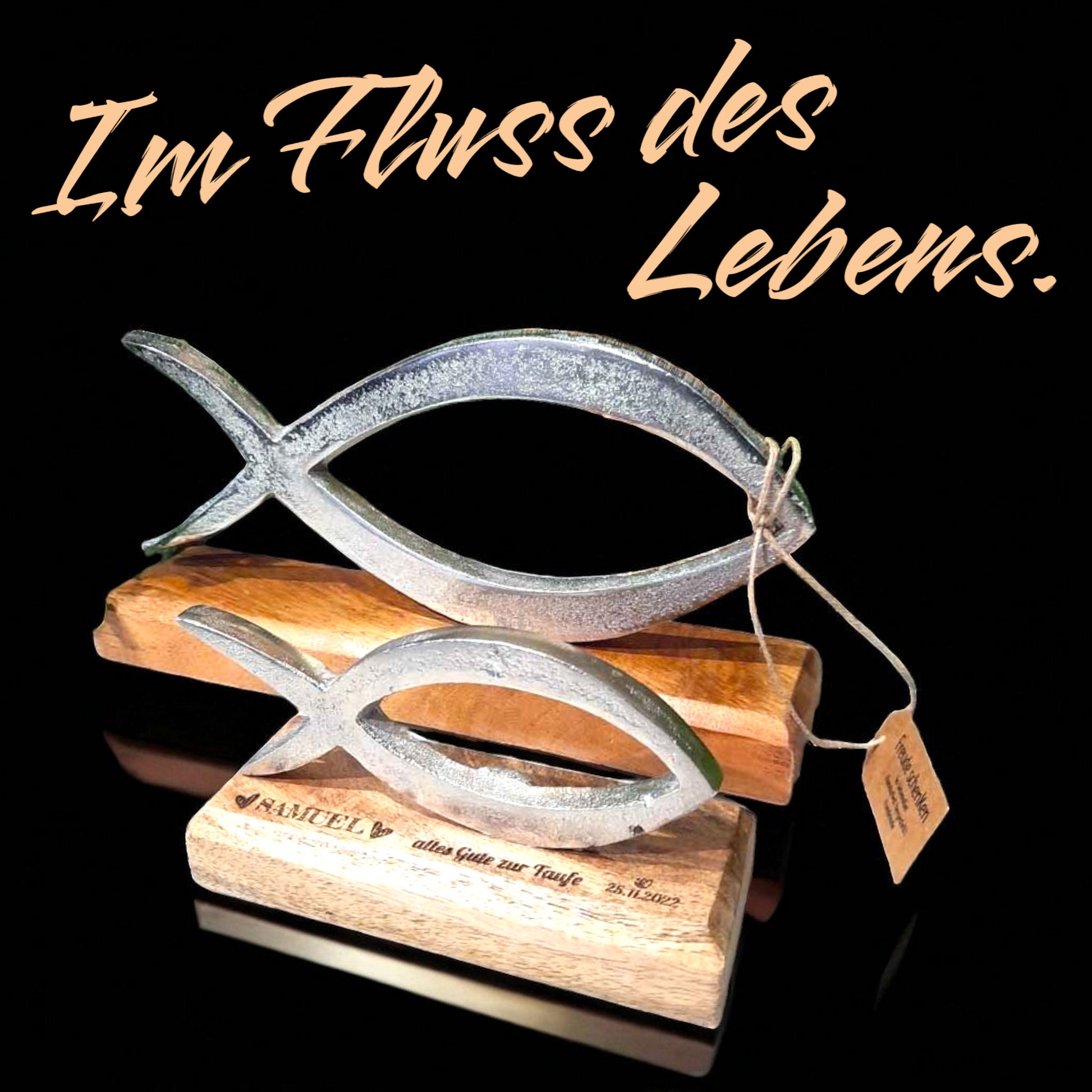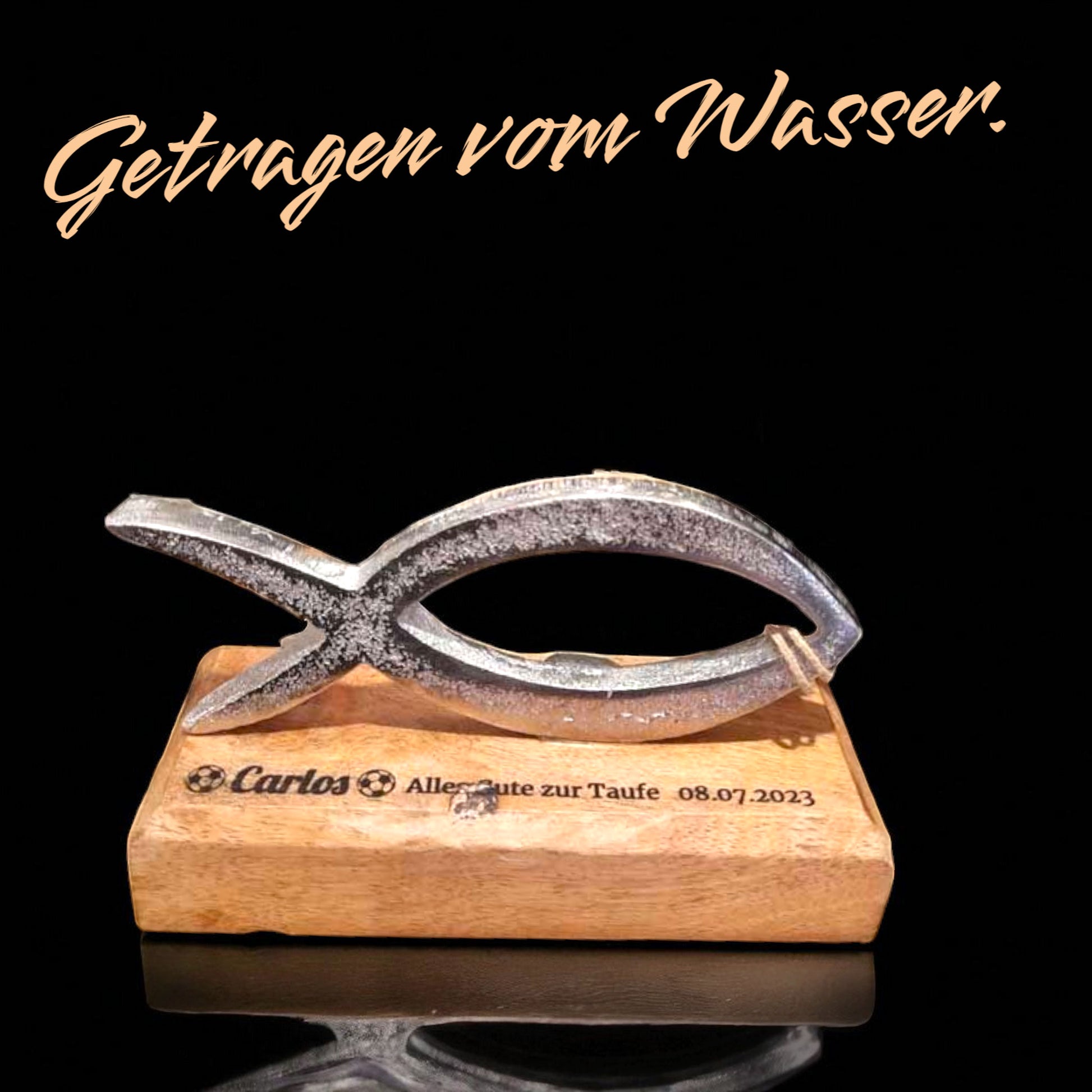Silberner Fisch Aufsteller mit graviertem Holzsockel