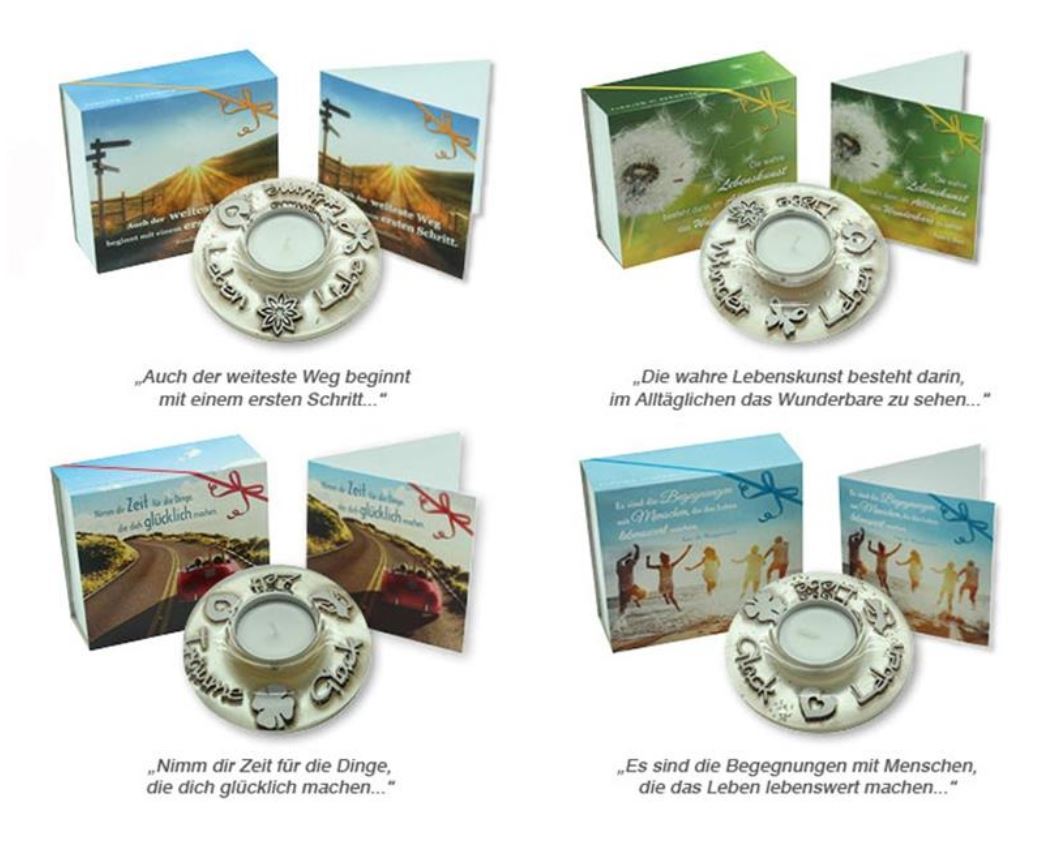 Die Teelichthalter mit Spruch sind wunderbare Geschenkideen zu den verschiedensten Anlässen. Ob als kleine Geste zwichendurch, als Abschiedsgeschenk, Geburtstagsgeschenk oder Hochzeitsgeschenk finden Sie sicher die passende Lebensweisheit.