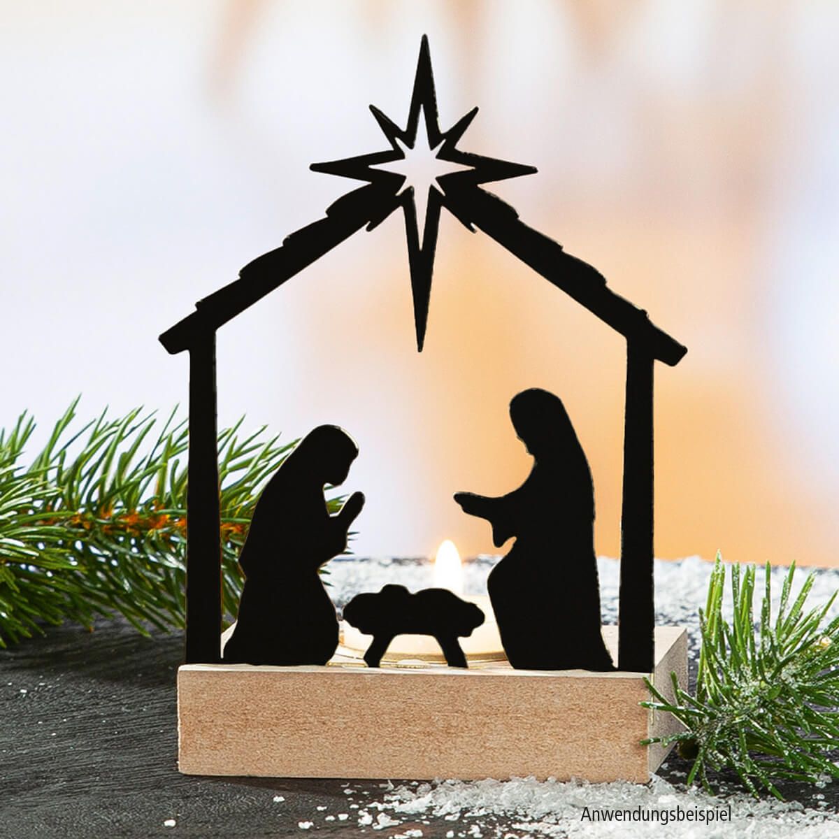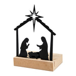 Ein stilvoller Teelichthalter mit filigraner Krippenszene aus schwarz lackiertem Metall auf einem Holzsockel. Das warme Licht eines Teelichts lässt die Silhouetten von Maria, Josef und dem Jesuskind besonders schön erstrahlen.