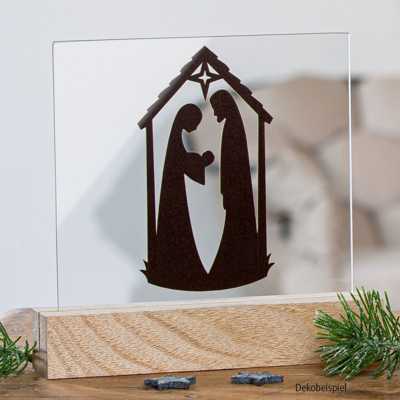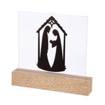 Außergewöhnlich und sehr modern: Tischaufsteller aus Holz mit Glasscheibe, die mit Maria und Josef schwarz in Scherenschnitt-Optik bedruckt ist.