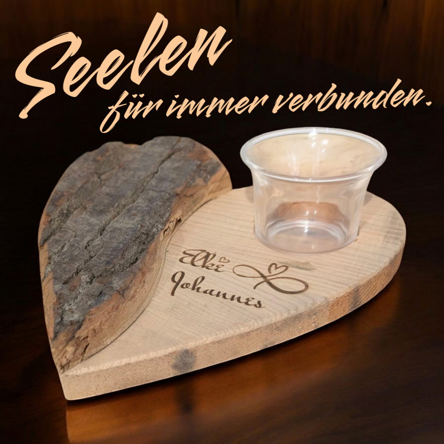 Herz Leuchter aus Holz mit Baumrinde und Teelichtglas personalisiert