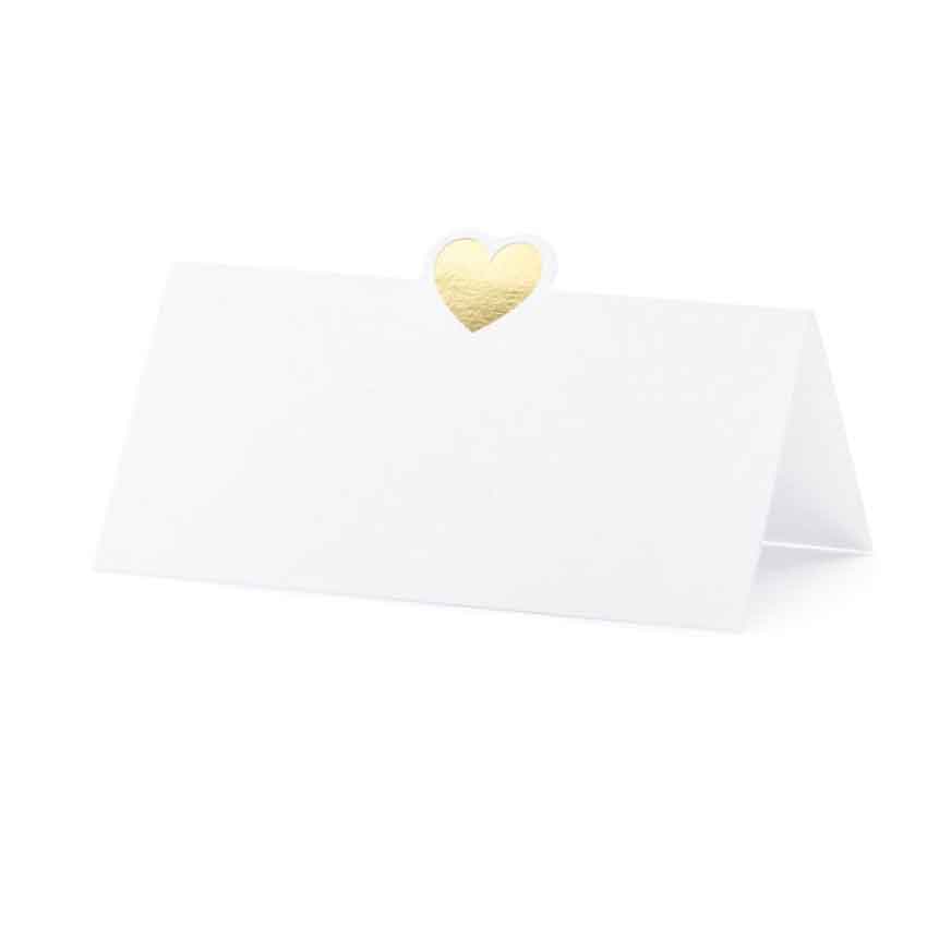 Tischkarten aus weißem Papier mit goldenem Metallherz