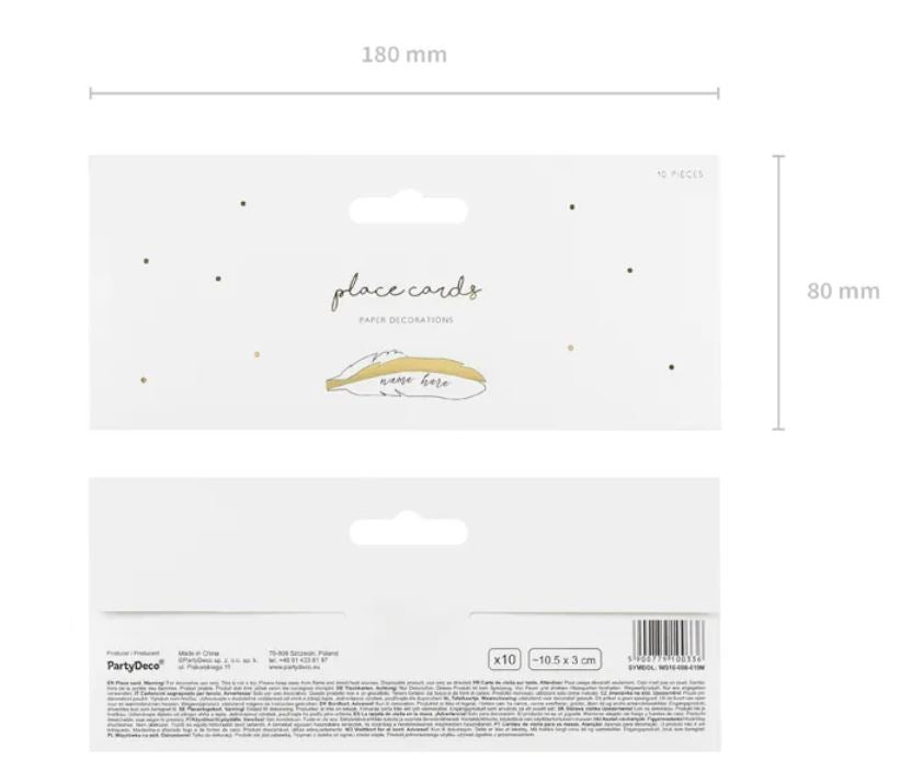 Diese eleganten Tischkarten in Form einer Feder machen die Platzzuweisung auf Ihrere nächsten Festivität zu einer echten Besonderheit. Die Farbgebung ist in edlem Metallic Gold und Weiß gehalten und passt so zu zahlreichen Farbkonzepten. Durch das Aufklappen der Rückseite der Tischkarten Feder stehen diese eigenständig und können überall platziert werden.