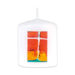 Kleine Kerze, mit modernen Kreuzdesign und orange-roten Farben. Eignet sich schön zur Tisch- Dekoration zu Ostern.