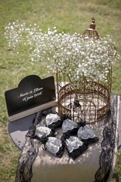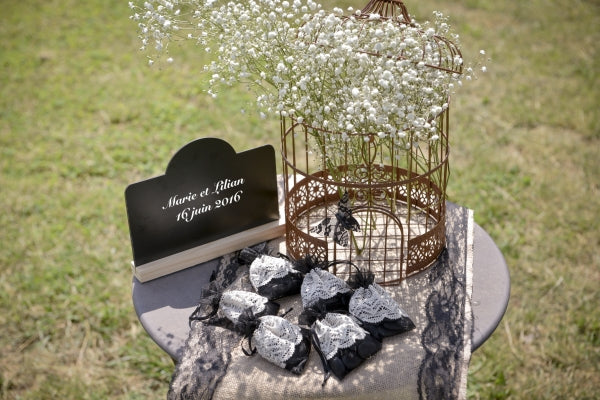 Die Kombination von Jute und Spitze erlangt ihren Charme durch die eigentlich so gegensätzliche Wirkung. Die rustikale Jutestruktur in mit ihrer natürlichen, braunen Farben steht im Kontrast zu der leichten und filigranen Spitze mit ihrem Spiel aus verschiedenen Transparenzen.