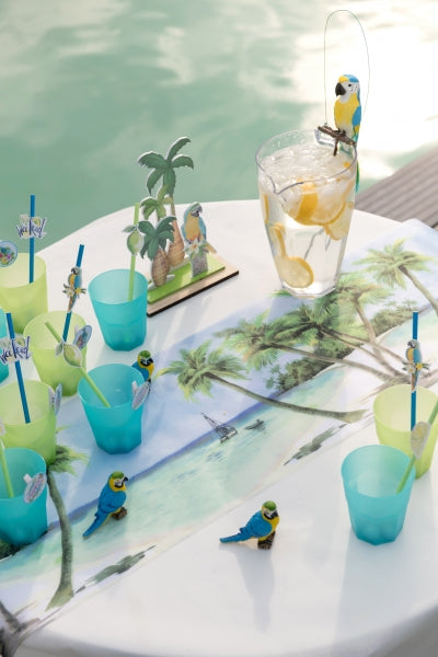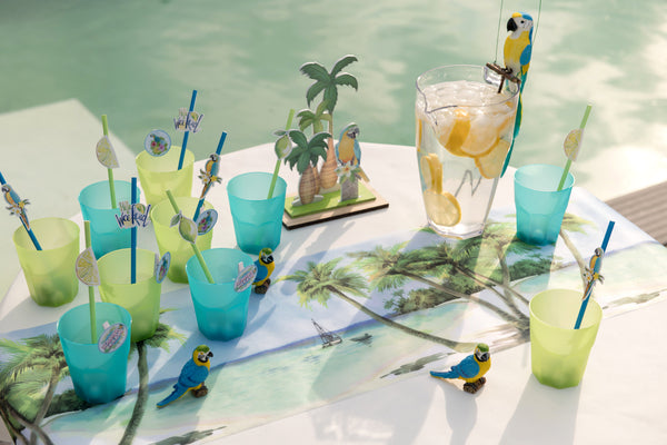 Diese bezaubernde Kombination erzeugt Urlaubsatmosphäre und ist die perfekte Deko für Ihre Beach Party, egal ob im Freien oder in einem Raum. Ergänzen Sie den Tischläufer mit farblich passendem Geschirr, Muscheln, leuchtenden Kerzen und frischen Blumenarragements, um die tropische Atmosphäre zu verstärken.