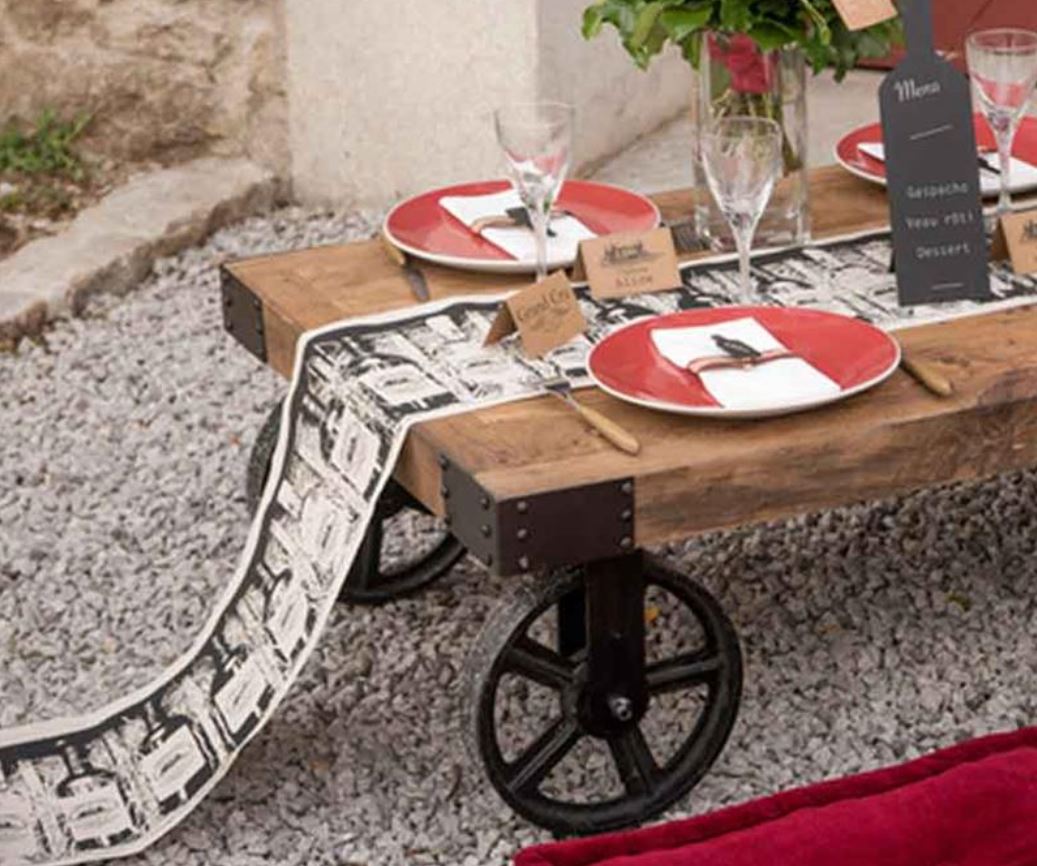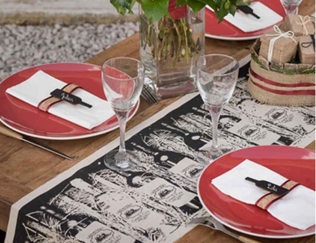 Der weiße Tischläufer mit aufgedruckten Weinflaschen schafft das passende Ambiente und wird mit weiteren Accessoires sicherlich ein Eyecatcher.