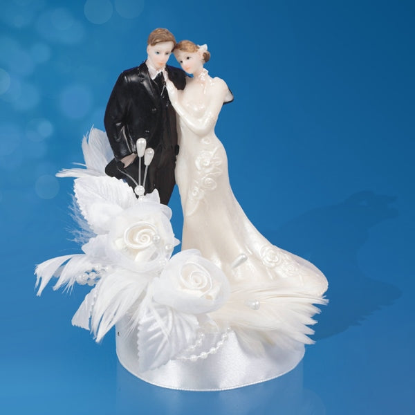 Tortenfigur "Brautpaar stehend mit Blumen und Federn" weiß