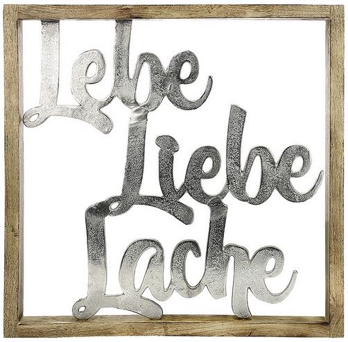 Das zeitlose Design aus einem harmonischen Materialkontrast von braunem Holz und silber glänzendem Metall lässt eine edle Dekoration entstehen, welche gleichzeitig warm und gemütlich wirkt. Abgerundet wird das schöne Design durch die motivierende Botschaft "Lebe, Liebe, Lache".