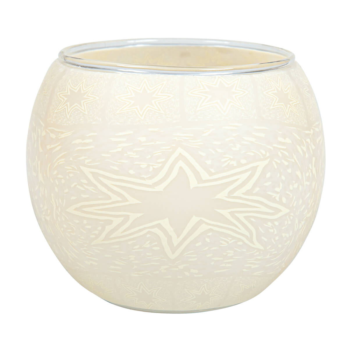 Dieses weiße Leuchtglas mit elegantem Sternmotiv sorgt für eine ruhige und stimmungsvolle Atmosphäre. Das zarte Muster wirkt besonders schön, wenn ein Teelicht oder eine LED-Lichtquelle im Inneren platziert wird. Dadurch entsteht ein sanftes, warmes Leuchten, das lange Winterabende gemütlich erhellt.