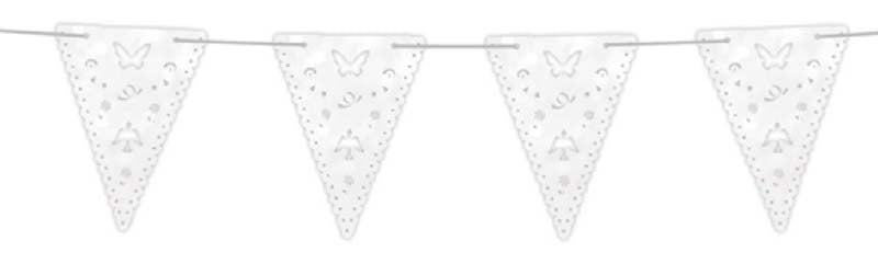 Diese elegante Wimpelkette in schimmerndem Pearl Weiß ist die perfekte Dekoration für festliche Anlässe. Die feinen Ausstanzungen verleihen ihr eine edle Note und machen sie ideal für Hochzeiten, Kommunionen oder Taufen.