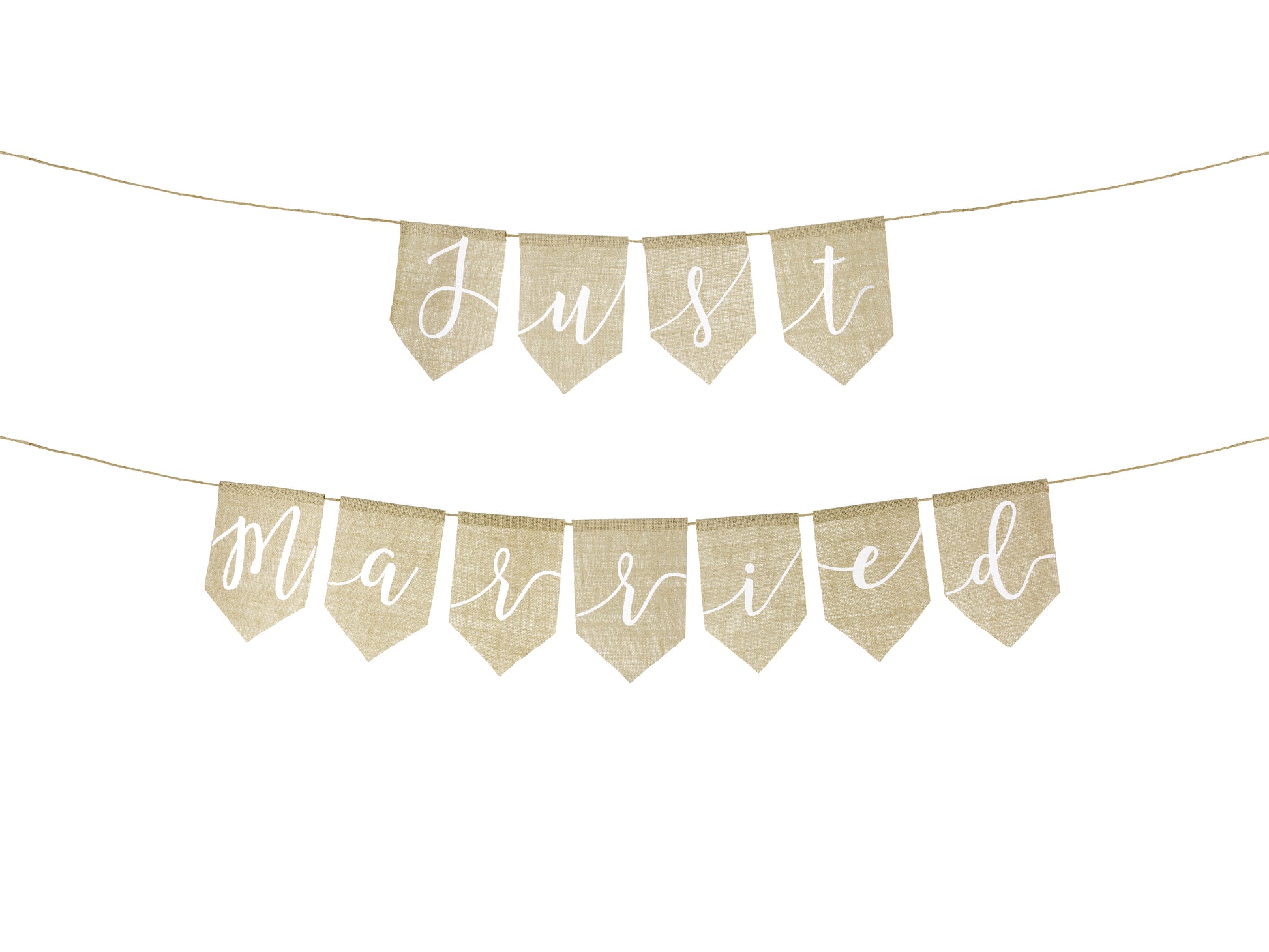 Die einzelnen Wimpel dieser Vintagehochzeitdeko sind mit den Worten "Just Married" bedruckt. Besonders praktisch ist, dass der Banner aus zwei einzelnen Ketten besteht und so ganz individuell dekoriert werden kann.