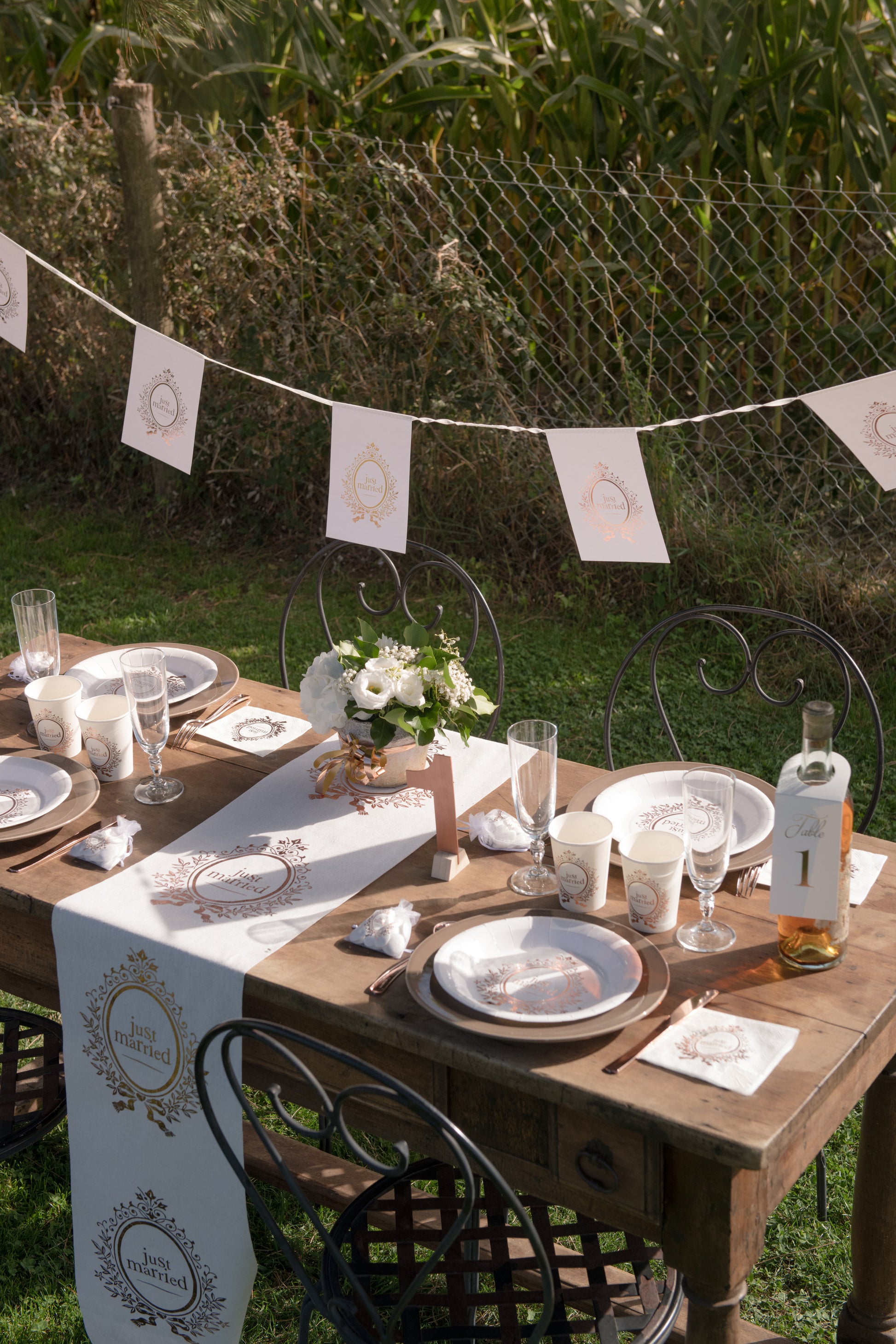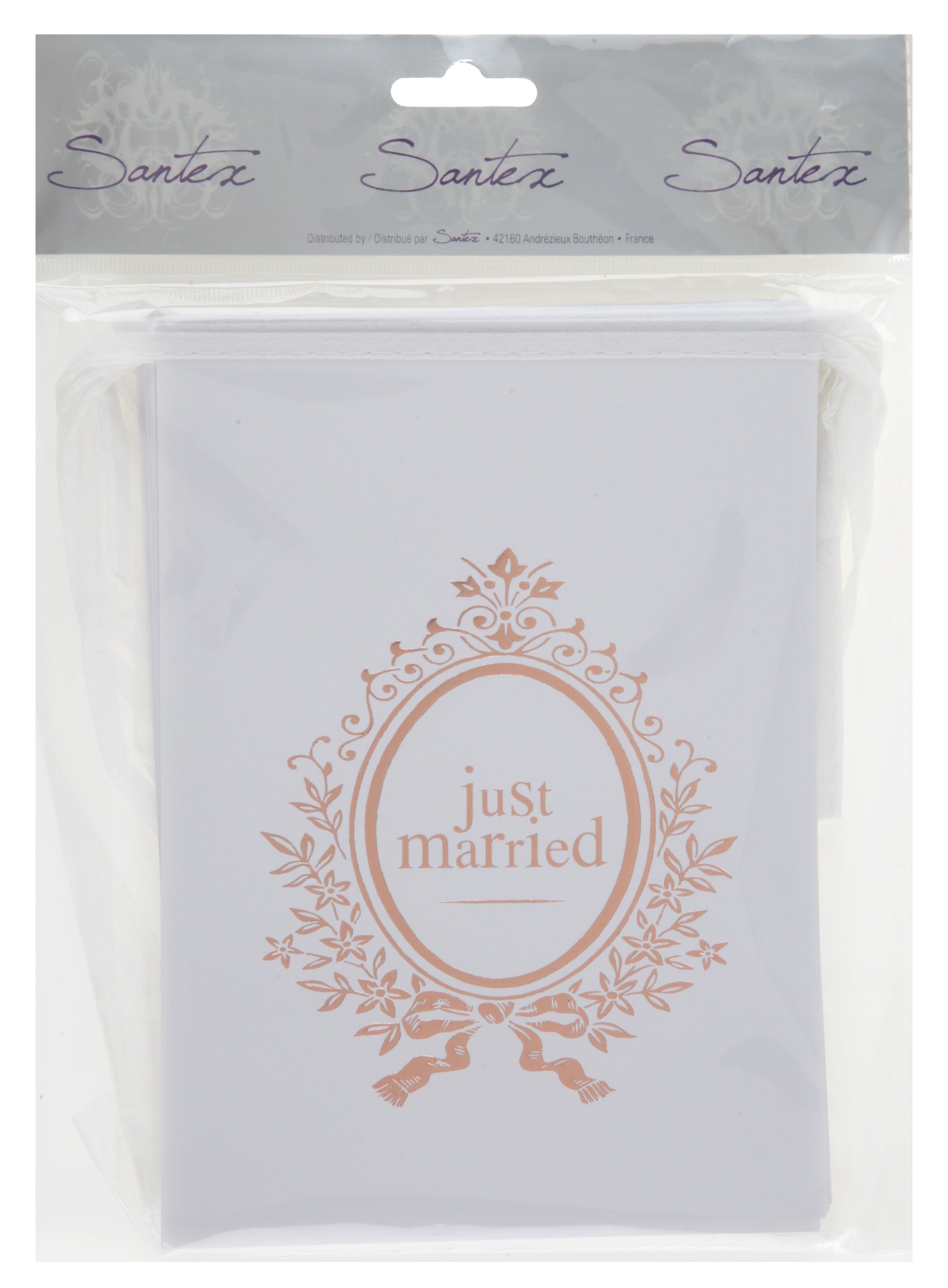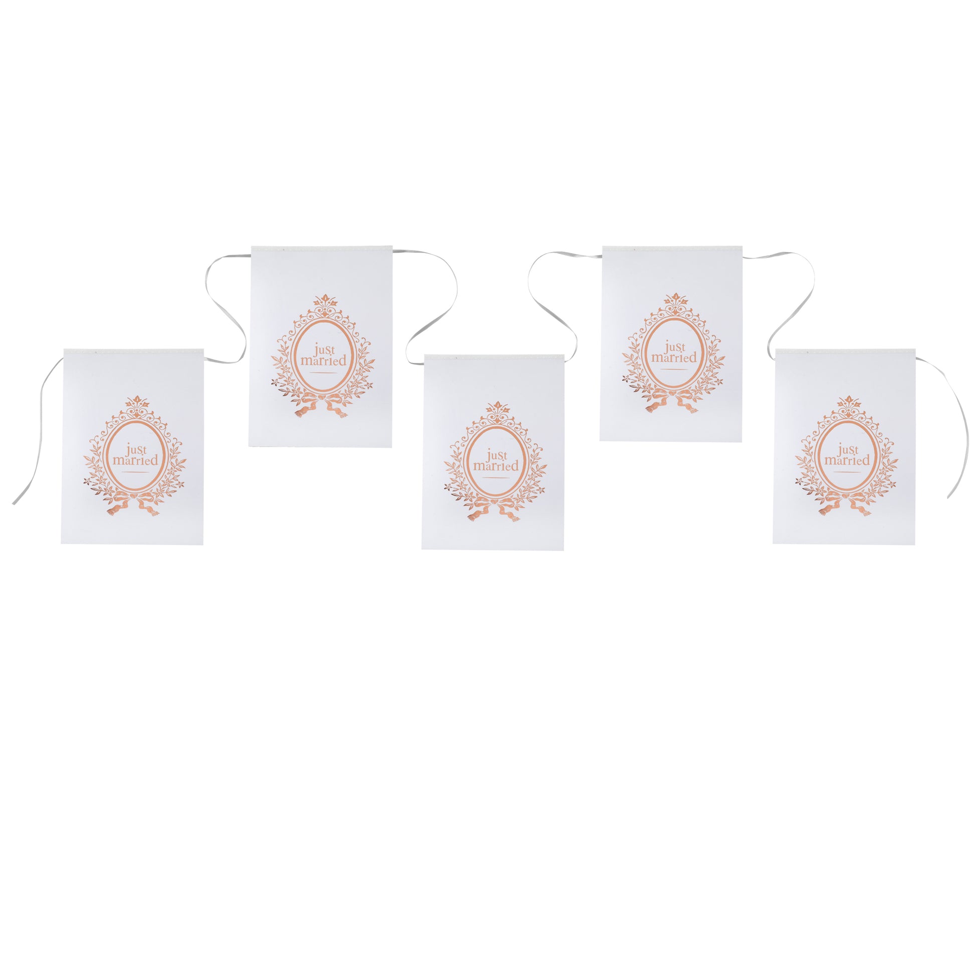 Wimpelkette bestehend aus 15 Wimpeln in Weiß mit metallischem Aufdruck "Just Married". Das trendige Roségold darf auf keiner Hochzeit fehlen.
