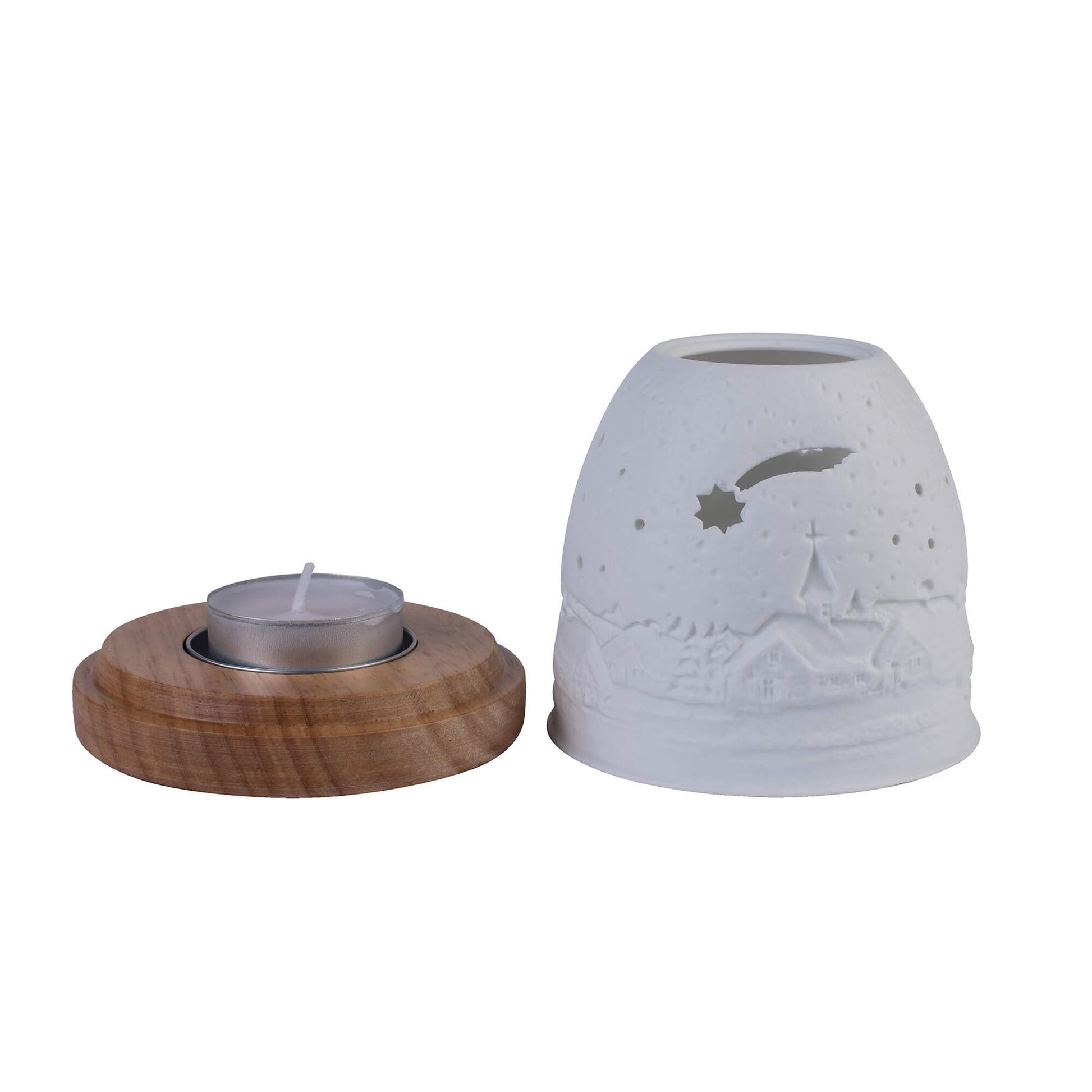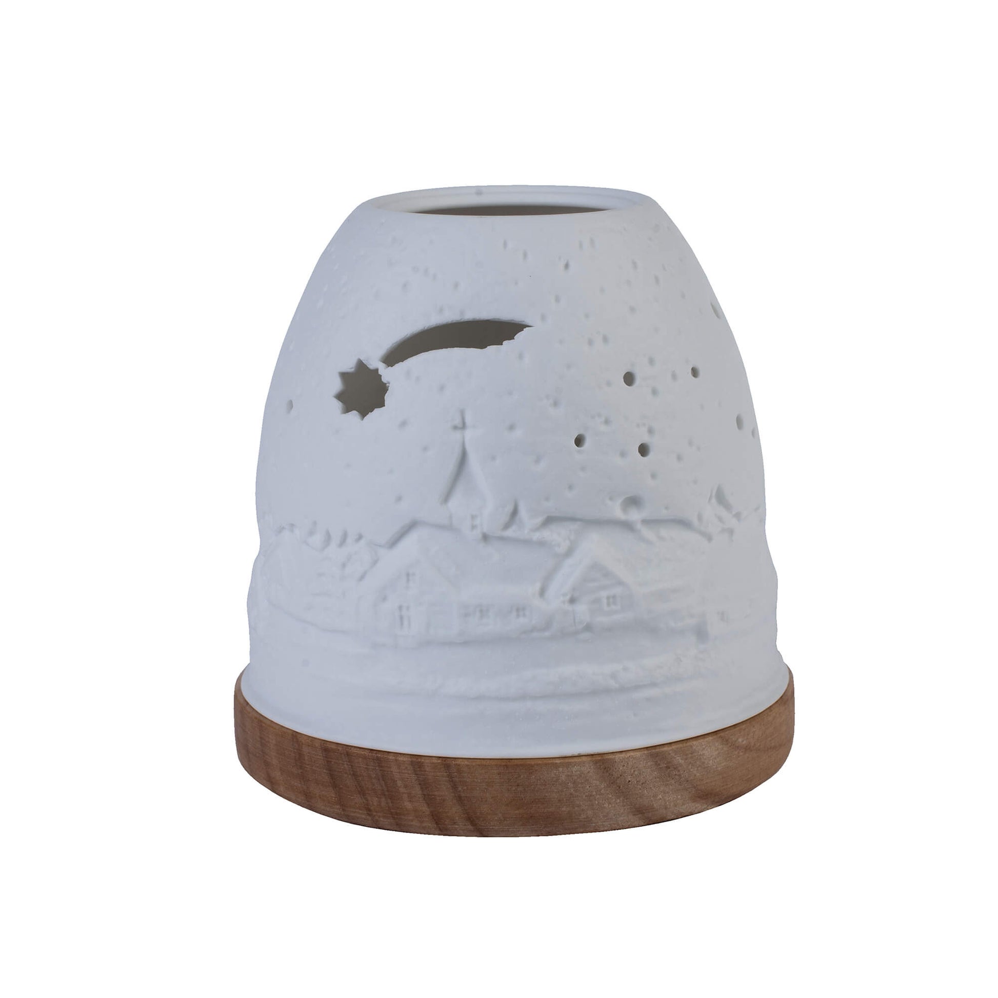 Windlicht Krippe aus feinem Porzellan, lässt sich von innen mittels eines Teelichtes beleuchten. Dafür ist im Sockel aus zertifiziertem Gummibaumholz ein Metallhalter eingesetzt.