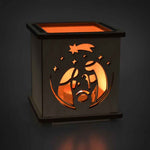 Windlicht "Krippe" aus FSC-zertifiziertem Birkenholz mit ausgesägtem Krippemotiv.